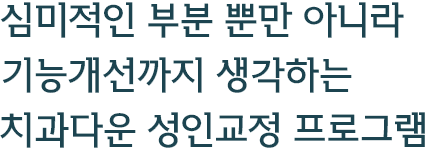 얼굴과 치아의 전반적인 조화와 건강을 생각하는 치과다운 성인교정 프로그램은 복잡한 전체교정부터 앞니 급속교정까지 전체 치과의사 중 단 4%인 치과교정과 전문의가 전문적으로 치료합니다.